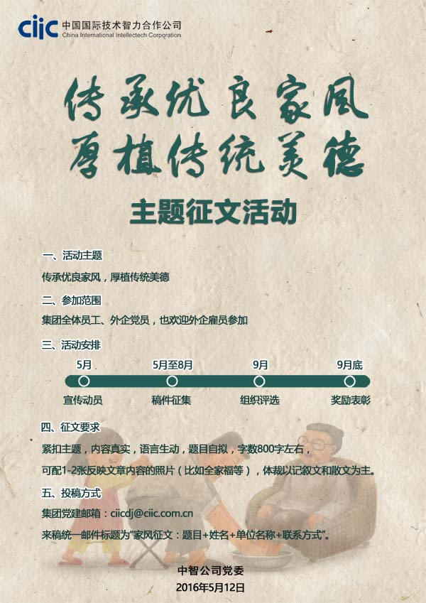 集團(tuán)黨建郵箱:ciicdj@ciic.com.cn;來(lái)稿統(tǒng)一郵件標(biāo)題為“家風(fēng)征文:題目+姓名+單位名稱+聯(lián)系方式”。